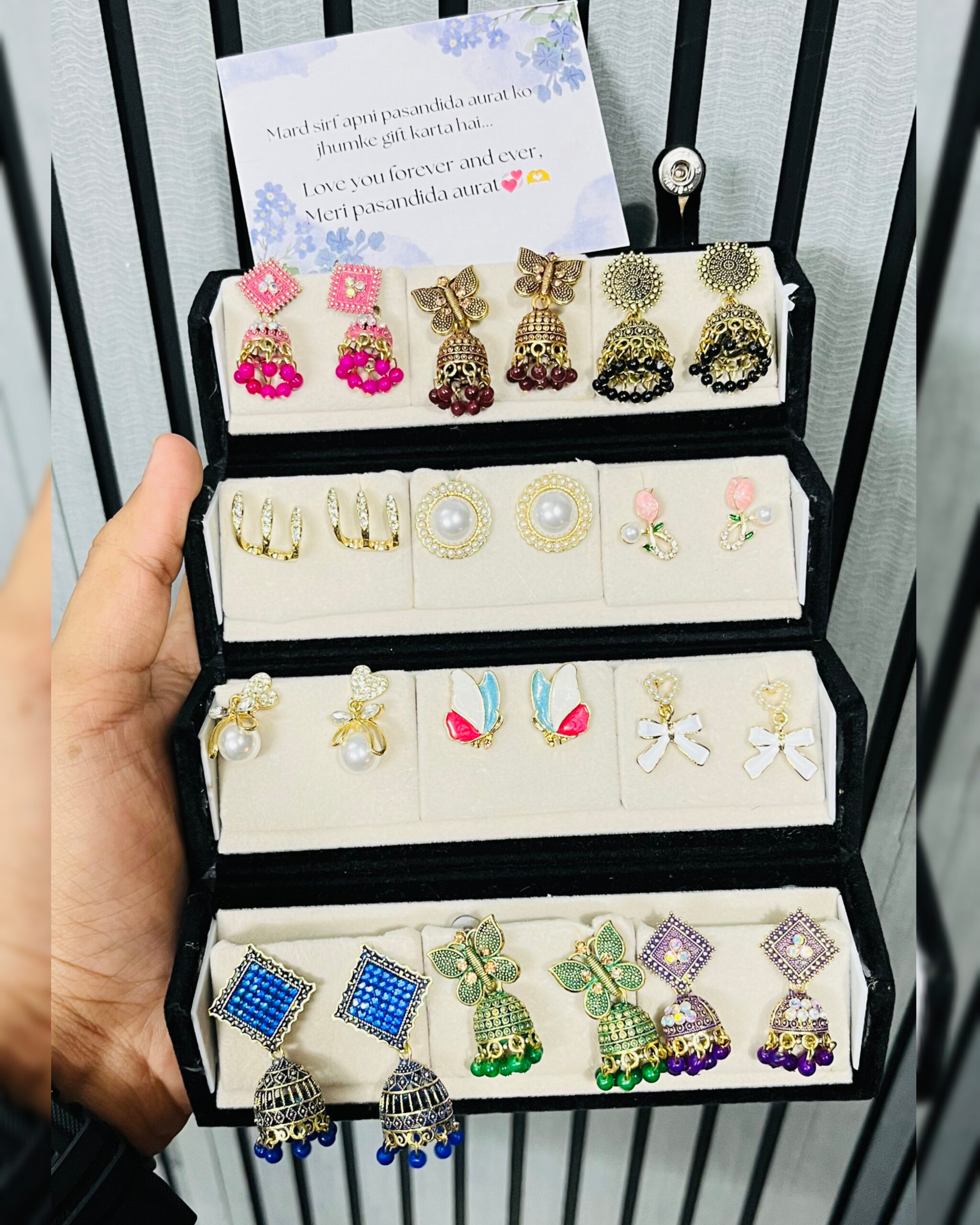 Add a touch of elegance to your jewellery collection with this beautiful earrings box. It includes 6 colourful traditional jhumkas and 6 premium Korean earrings, perfect for both ethnic and modern outfits. Each pair is carefully selected to bring variety and style to your look. A perfect gift for women who love stylish accessories.